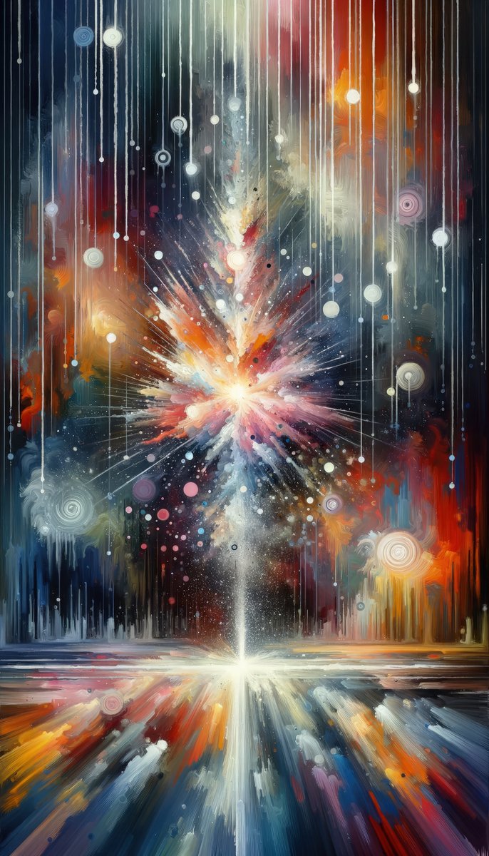 Titled Galactic Mind Clarity, this vertical artwork is a vivid symphony of color and light, embodying the Tachism style that emphasizes spontaneous, subconscious creation. At the painting s core, a radiant burst of white light serves as the epicenter of clarity, from which extends a galaxy of thoughts and ideas. This central brilliance fades into a spectrum of fiery oranges, reds, and yellows at the top and cool blues at the bottom, suggesting a balance of warm emotions and cool reasoning. Below this eruption of light and color, streaks of paint represent the mind s galaxy—streams of consciousness, falling like rain in organized chaos. White dots and circular motifs that resemble planetary bodies and atomic structures are scattered throughout, symbolizing individual thoughts or concepts within the mental universe. These elements float and fall within the galactic expanse, suggesting continuous motion and the dynamic nature of thought. The painting s background shifts from deep, cosmic blues to vibrant oranges and reds, reflecting the diversity and complexity of the psyche. Cloudy textures and whirls contribute to the sense of vastness and depth, standing in for the nebulous and infinite space within the mind. Altogether, this image invites the viewer to contemplate the explosion of mental clarity amidst the ever-shifting constellations of thoughts that comprise our internal cosmos, illuminating the beauty and complexity of human cognition and introspection.