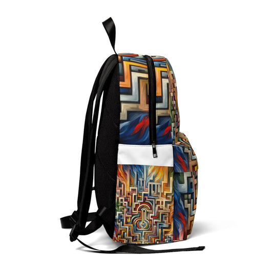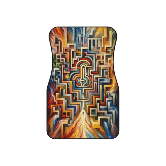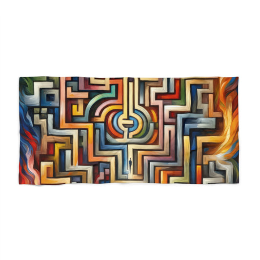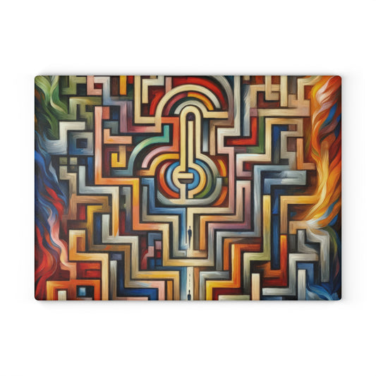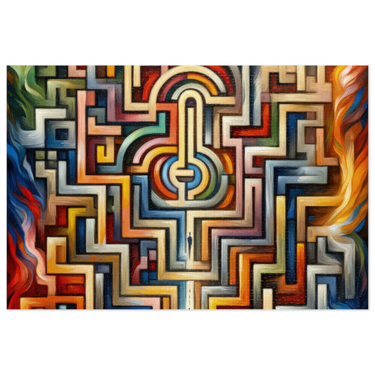 The artwork titled Labyrinthine Love Choices is a vertical Tachism style painting that visually encapsulates the theme of The Labyrinth of Love and Choices . The composition is vivid and intensely colored, suggesting a deep emotional journey punctuated by moments of passion and contemplation. At the center lies a complex maze-like structure composed of intertwining paths and blocks rendered in various warm and cool hues. The array of colors ranging from fiery reds and oranges to calming blues and greens symbolize the spectrum of emotions and states one encounters through the trials of love and decision-making. Each path within the labyrinth seems to offer a new direction, much like the choices one faces in the pursuit of romantic and emotional connections. There is a notable concentration of circular patterns and lines near the heart of the maze, perhaps indicating the cyclical nature of relationships and the repetitive challenges inherent in navigating them. The painting conveys movement through swirling brushstrokes, mimicking the psychological and emotional turbulence that accompanies the intricacies of love and life s choices. Standing at the entrance of the labyrinth is a lone figure, offering a human element to the otherwise abstract depiction—a silent protagonist embarking on this profound and universal quest.