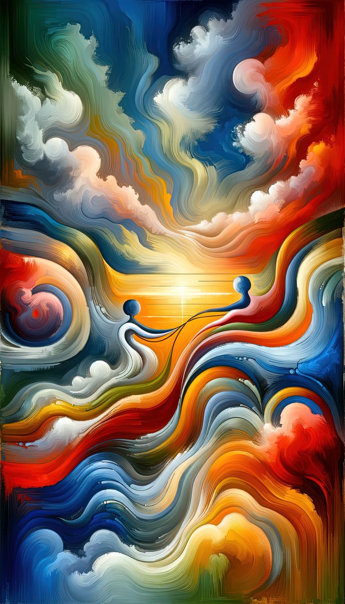 Titled Empathetic Lifeline Abstract, this image is a vertical Tachism style painting that symbolizes The Art of Empathy: A Lifeline in the Sea of Interaction . This expressive piece of abstract art portrays a vivid fusion of swirling colors and dynamic shapes that evoke a sense of motion and emotional depth. The center of the artwork features a radiant point of light, possibly symbolizing hope or connection, from which ripples of various hues seem to emanate. These ripples shift and blend into each other, with some areas exhibiting swirling patterns that mimic natural phenomena like clouds or waves. The theme suggests the intertwining of human emotions and the complex ways in which empathy can navigate through these interactions. The palette is rich and varied, featuring warm tones of orange, red, and yellow, which transition into cooler blues and greens, creating a visual spectrum that mirrors the complexity of human sentiments. The lush, layered brushstrokes enhance the tactile quality of the piece, providing a sense of depth and three-dimensionality. The painting s fluid shapes curl into forms reminiscent of human figures, appearing to reach out to one another with thin lines that could be interpreted as lifelines. This abstract representation could be seen as a metaphor for how empathy connects people through the chaotic tapestry of human experience. Overall, the artwork is a captivating representation of the emotional bonds that hold society together, and the essential role of empathy in human interaction.