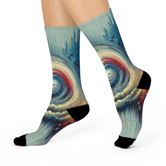 The image, titled Considerate Echoes Resonate, is an evocative vertical piece in Tachism style, rich with symbolic undertones depicting the sentiment of The Feedback Loop: The Echo of Considerate Critique. The artwork captures an ethereal cityscape at its upper horizon, where skyscrapers blend into a misty backdrop, giving way to an imposing swirl dominating the composition. The swirl is a mesmerizing vortex of concentric circles, meticulously detailed with myriad hues and shades that reverberate outwards from a central point, as if echoing through a visual medium. Cascading downwards from this hypnotic spiral are countless droplets and orbs in a spectrum of colors ranging from warm yellows, oranges, and reds to cooler blues and purples, seemingly representing the dissemination of thoughts and ideas. These elements are reminiscent of careful, considerate feedback, each imprinted with ripples indicative of impact and resonance. Below this spectacle, layers of fluffy, cloud-like formations provide a soft contrast against the sharpness of the city and the fluidity of the central motif. The interplay of colors and forms evokes a sense of dynamism and flow, suggesting the ongoing cycle of communication and reflection. Paint appears to drip from the cloud forms, a visual metaphor for the persistent nature of critique and its ability to shape and influence over time. The entire composition is a thoughtful dance of form and color, elegantly capturing the essence of contemplative exchange.