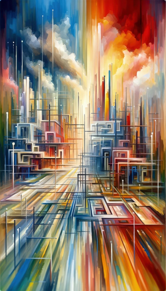 The artwork titled Urban Flow Interconnectedness unfolds as a vibrant, bustling cityscape...