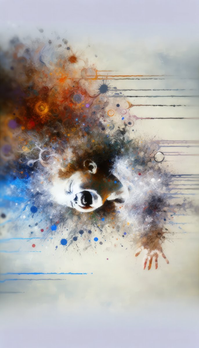 Laughter Essence Presence is a captivating vertical image created in a Tachism...