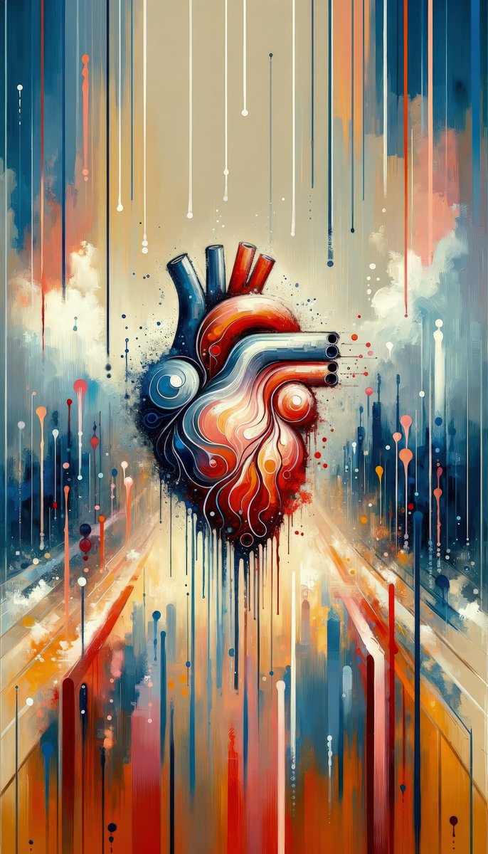 Titled Rhythmic Heart Harmony, this vertical image depicts a vivid and abstract...