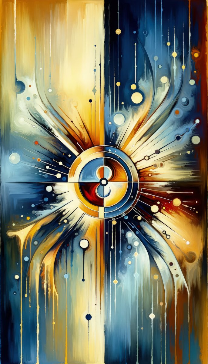 The image titled Empathetic Exchange Essence portrays a vertical Tachism style painting...