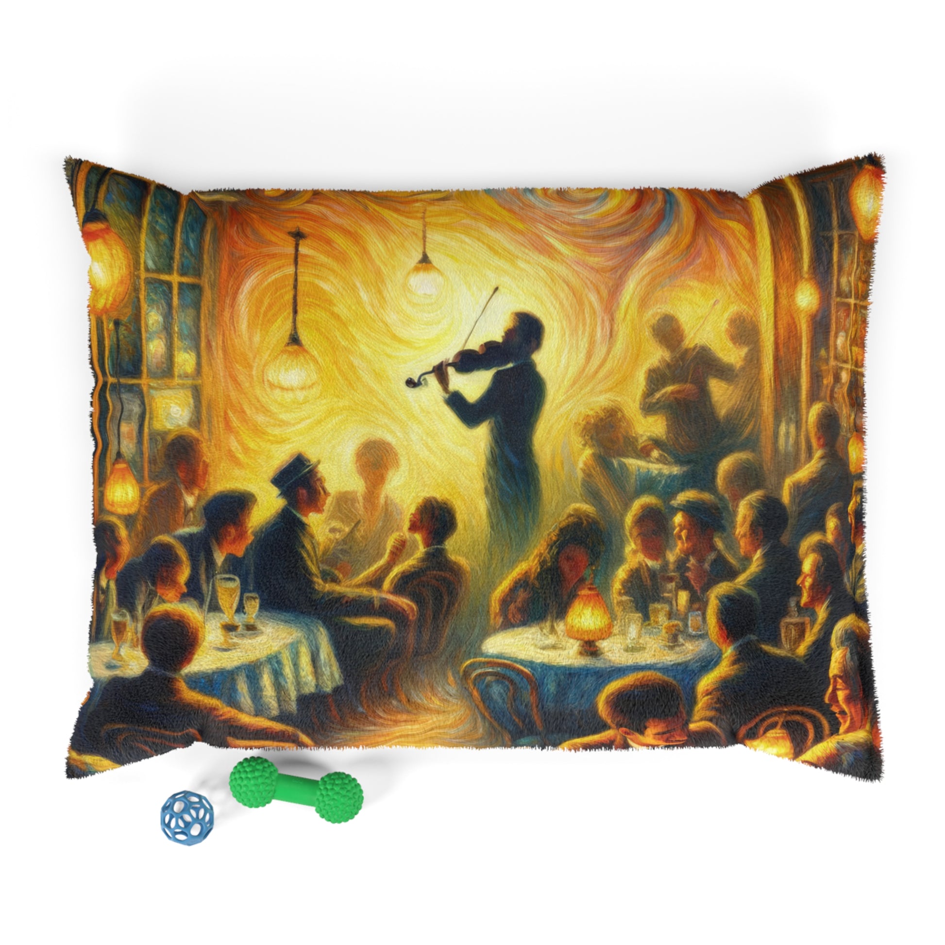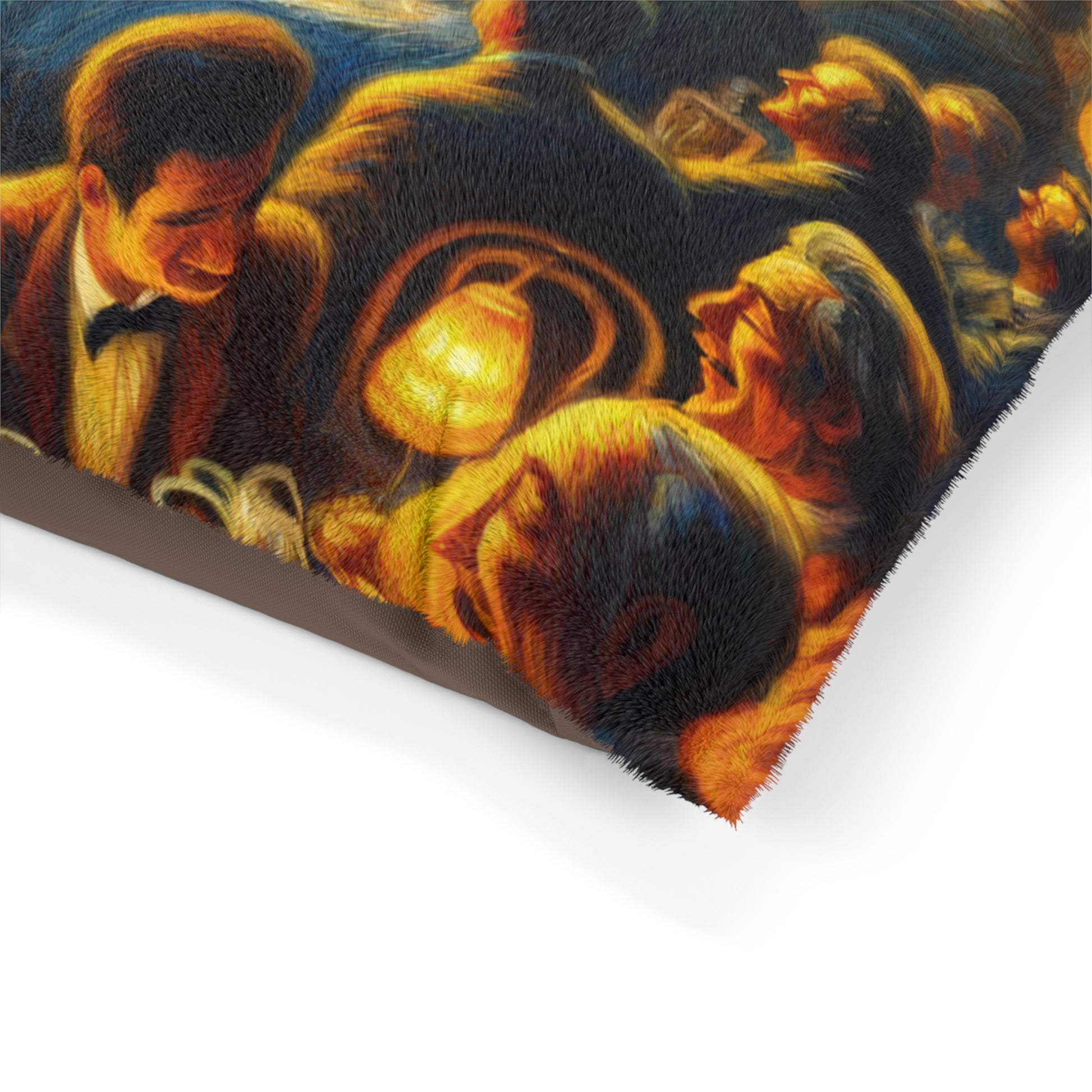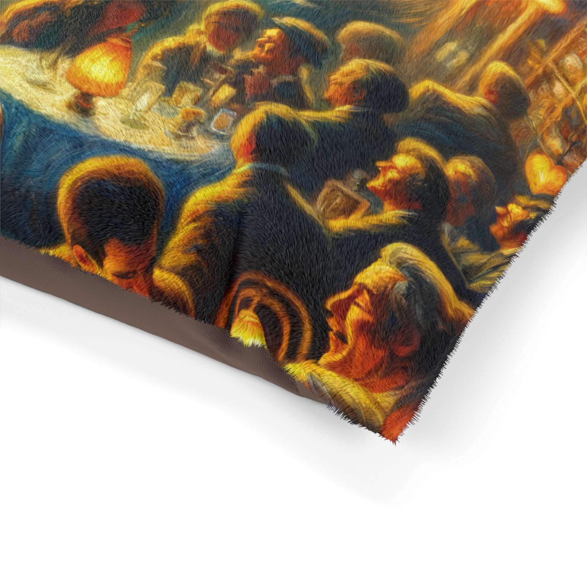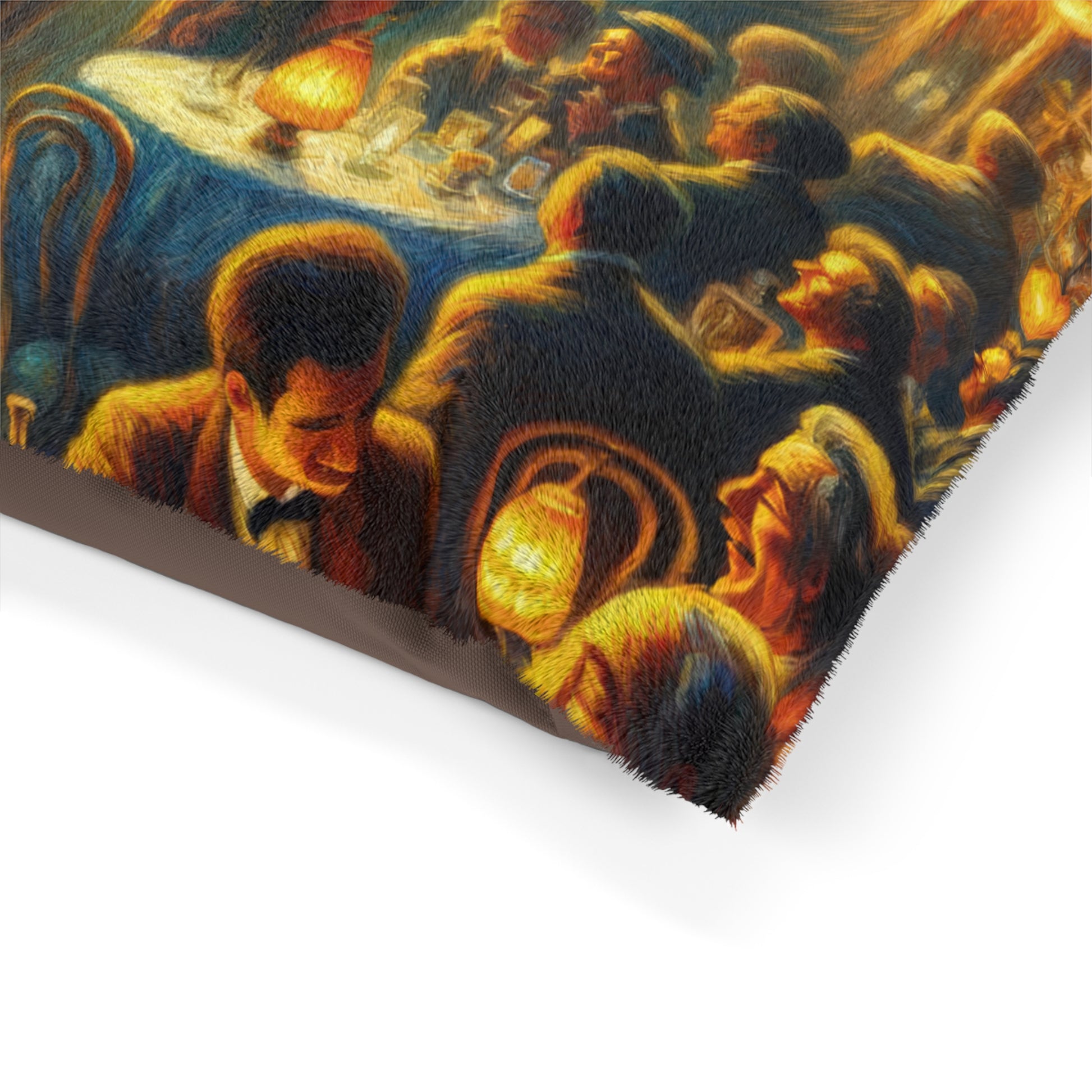 Transport your furry friend to a cozy bistro experience with our "Bistro Emotive Entry" pet bed. This masterpiece of art captures the essence of a warm, inviting gathering place, inviting your pet to lounge in style and comfort. The feather soft fleece exterior is printable on one side, while the dark brown zippered back and shape-retaining insert ensure durability and easy maintenance. Give your roving home security system a place of their own to relax and unwind, right at your feet. Perfect for indoor use, this pet bed is available in three sizes to suit your furry friend's needs. Add a touch of timeless beauty and joy to your home with this unique and luxurious pet bed.