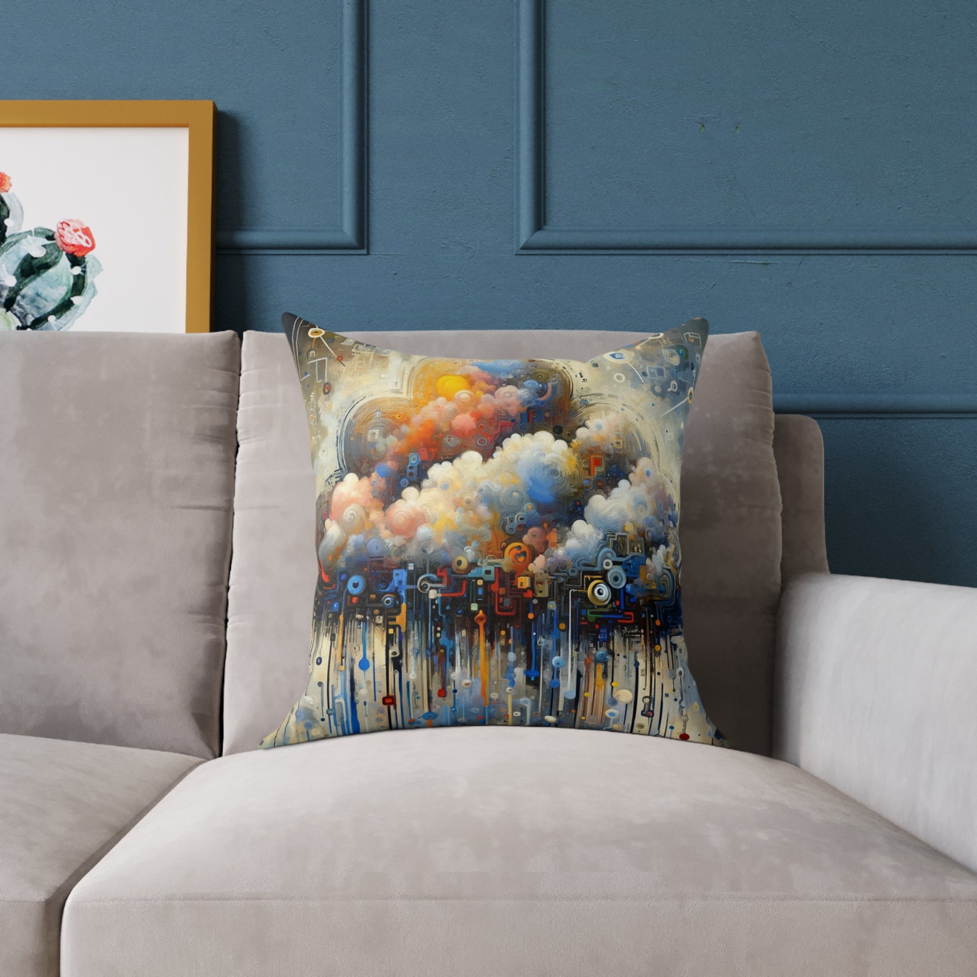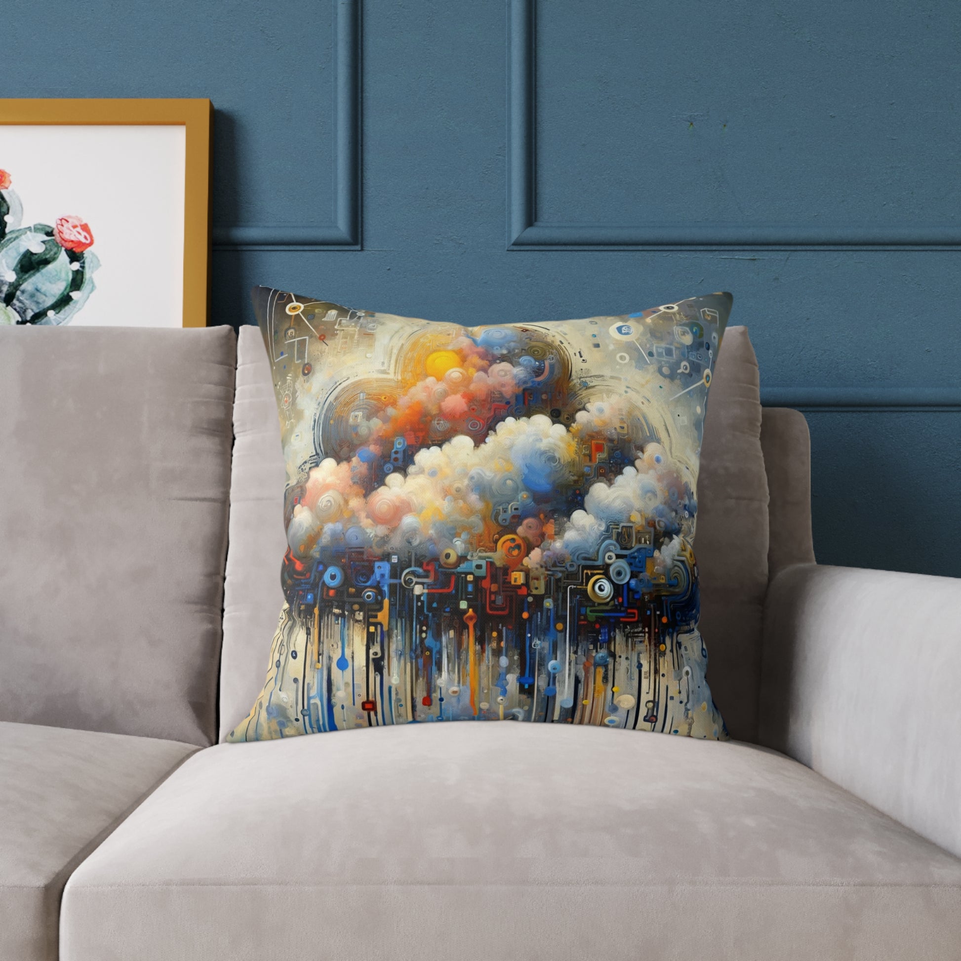 Elevate your home decor with our "Cloud Community Crafting" Spun Polyester Pillow, a vibrant and energetic piece inspired by the ever-evolving nature of online communities. The Tachism style used by the artist adds a sense of spontaneity and complexity to the composition, mirroring the intricate relationships found in virtual spaces. With its bold colors and expressive brushwork, this pillow invites viewers to explore its intricate details, much like the interconnected relationships that define digital communities. The hidden zipper and 100% polyester filling ensure a seamless and comfortable finish, while the double-sided print allows you to enjoy the artwork from any angle. Available in five sizes, this customizable pillow is sure to capture the eye of guests and uplift your mood, making it the perfect statement piece for any modern home. Add a touch of creativity and connectivity to your space with our unique and inspiring pillow design.