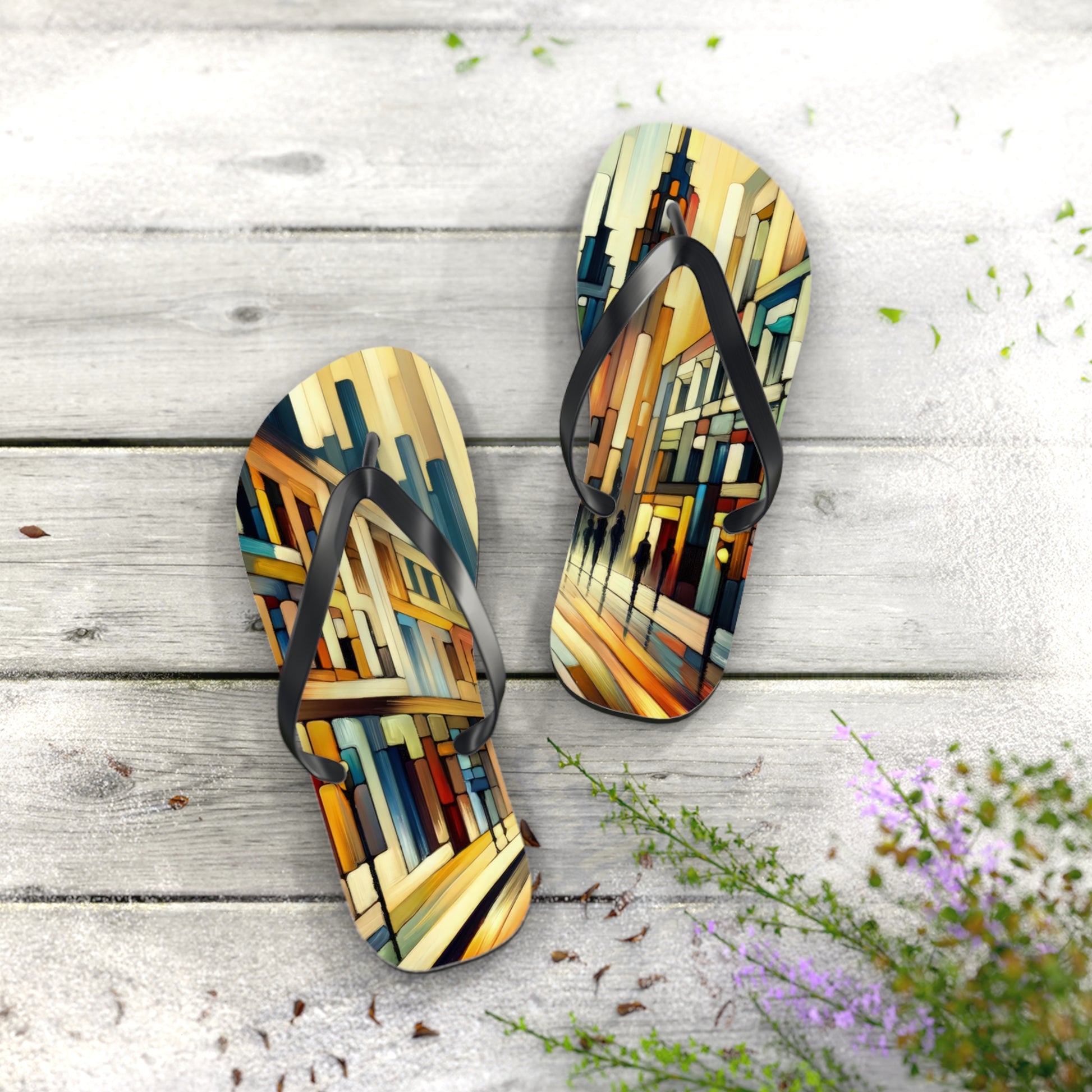 Step into the vibrant pulse of urban life with these personalized flip flops featuring the captivating painting "Cobbled Rhythm Heartbeat." The dynamic brushstrokes and abstract forms of Tachism style bring energy and movement to this design, while the warm and cool colors create visual harmony that pops against the textured bottom of the 5/8" thick EVA sole. With a cushioned footbed and easy slip-on design, these flip flops will keep you comfortable all day long as you navigate the bustling cityscape. Celebrate the beauty and vitality of urban living with every step in these unique and stylish flip flops. Available in multiple sizes for the perfect fit.