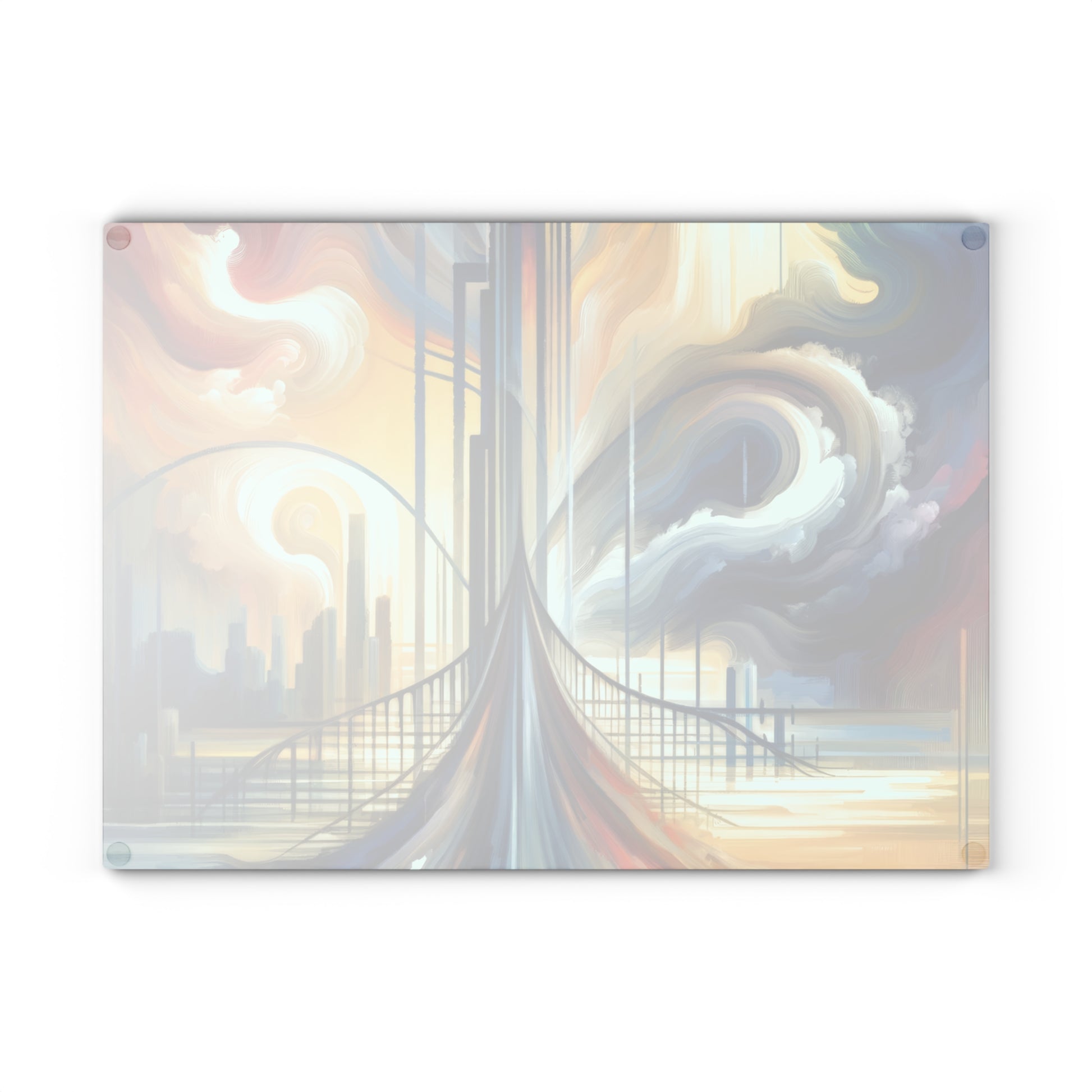 Elevate your kitchen style with our "Conscious Bridge Tachism" glass cutting board, featuring a visually captivating design that beckons viewers to ponder the connections between the physical and metaphysical realms. This custom cutting board is made from robust tempered glass, ensuring durability as you prepare delicious meals for years to come. The textured surface provides an ideal chopping, slicing, and dicing area, while the four rubber dots offer additional stability during use. Available in two sizes (8" x 11" and 11" x 15"), this cutting board is a unique and functional addition to any kitchen. Hand wash recommended to preserve the vibrancy of the design. Add a touch of artistry to your culinary experience with our "Conscious Bridge Tachism" glass cutting board.