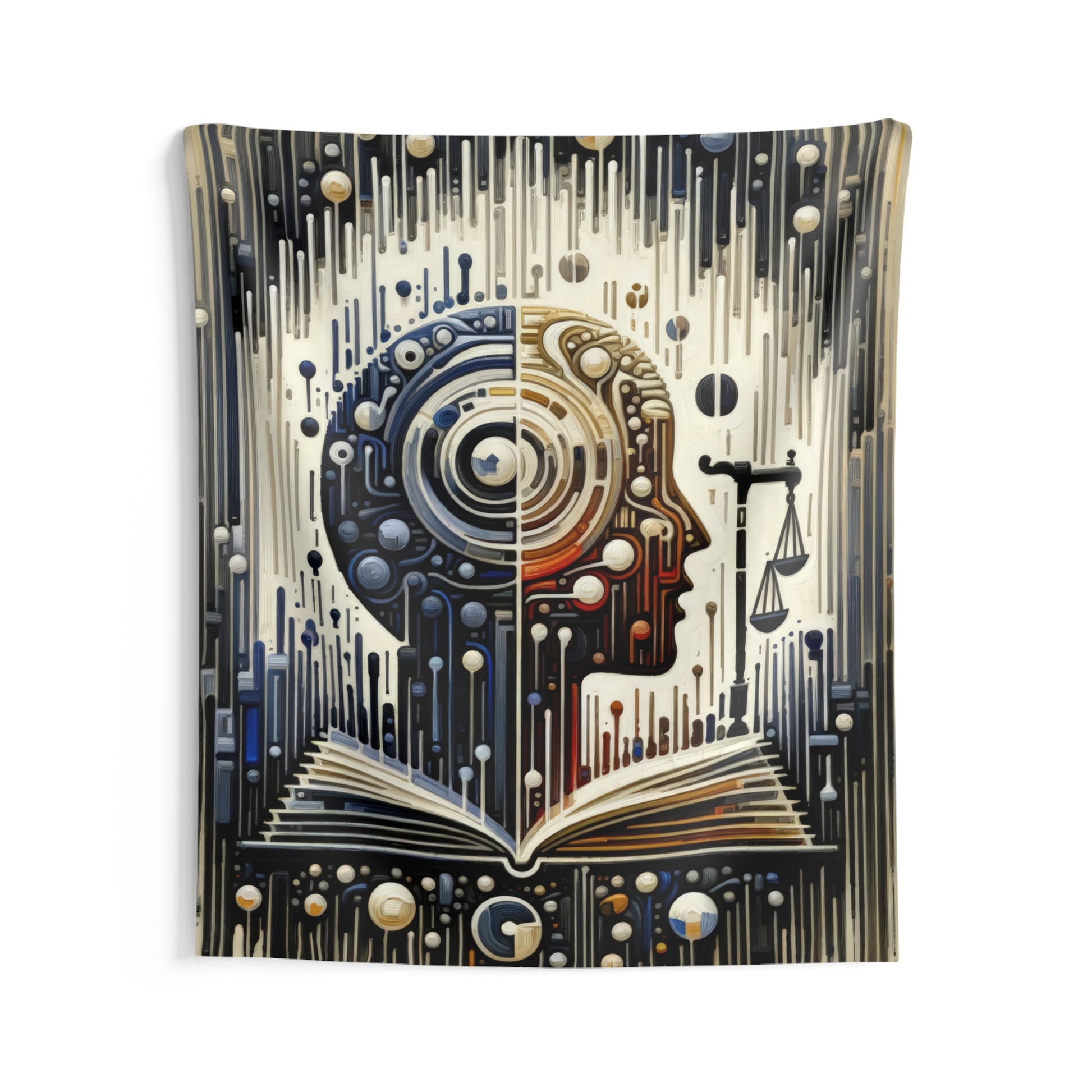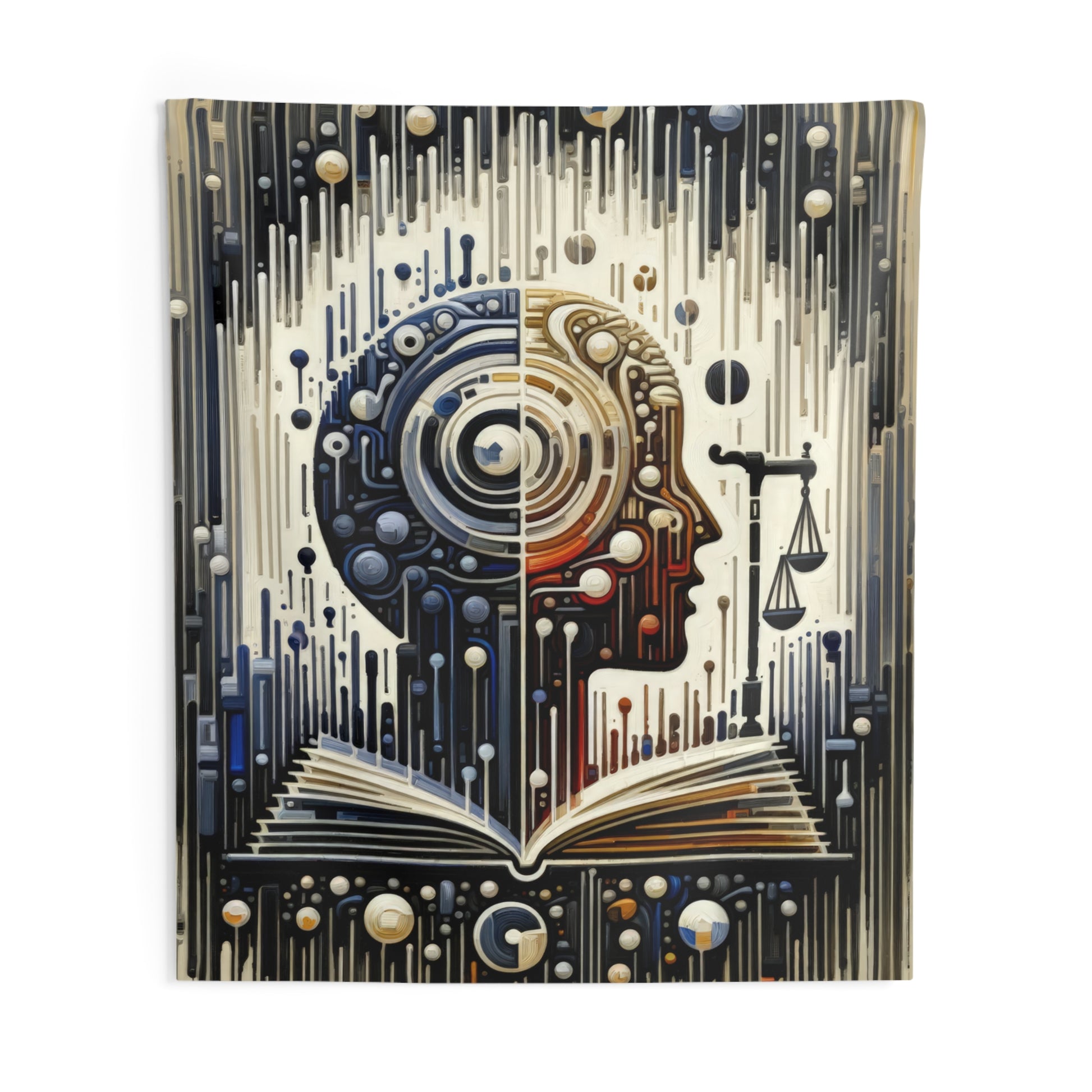 The intricate design of this tapestry captures the essence of critical analysis and evaluation, with symbolic elements that add layers of meaning to the overall composition. The dynamic use of vertical lines and dripping paint creates a sense of movement and energy, drawing the eye towards the central image of the open book. The color palette of black, dark blue, off-white, and light gray complements the theme of analytical thought and judgment, while adding a touch of sophistication to your decor.