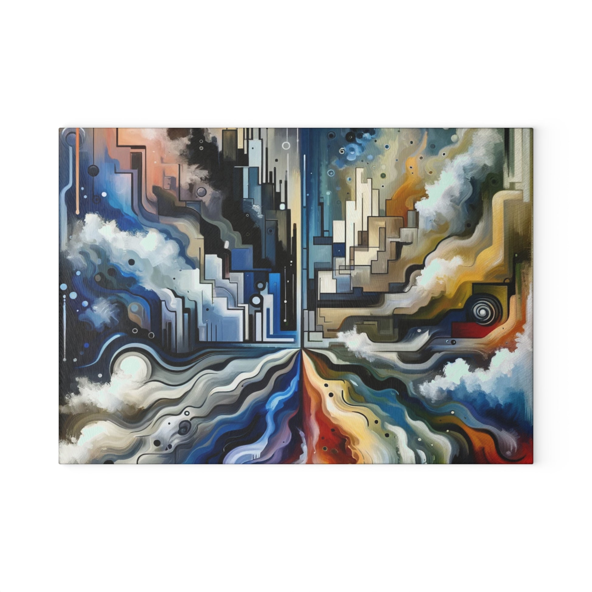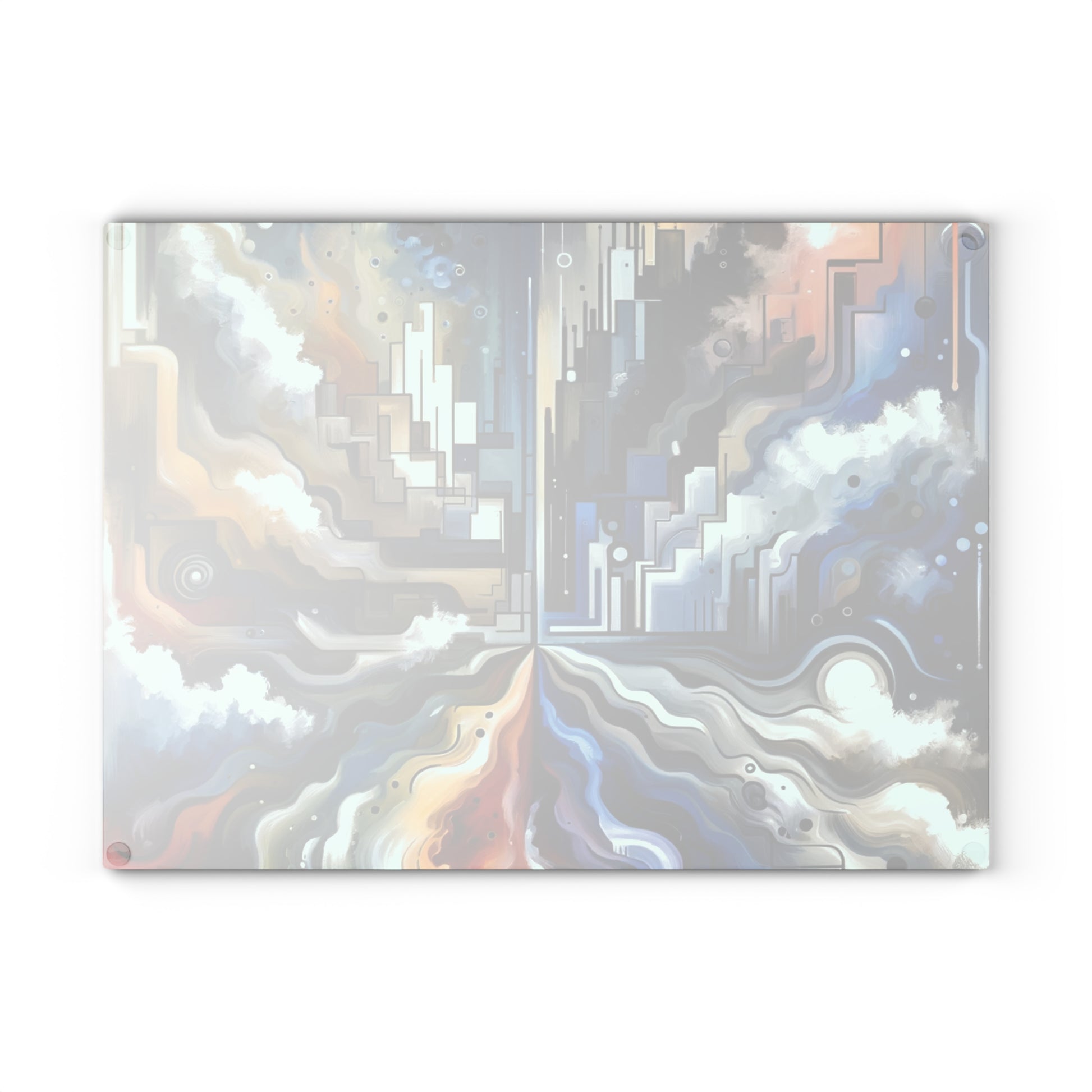 Elevate your kitchen space with the artistic flair of the "Digital Divide Navigation" glass cutting board. This unique piece features a Tachism-inspired design that captures the dynamic essence of technology and communication. The spontaneous brushstrokes and drips add a sense of movement, reflecting the fast-paced nature of the digital world.