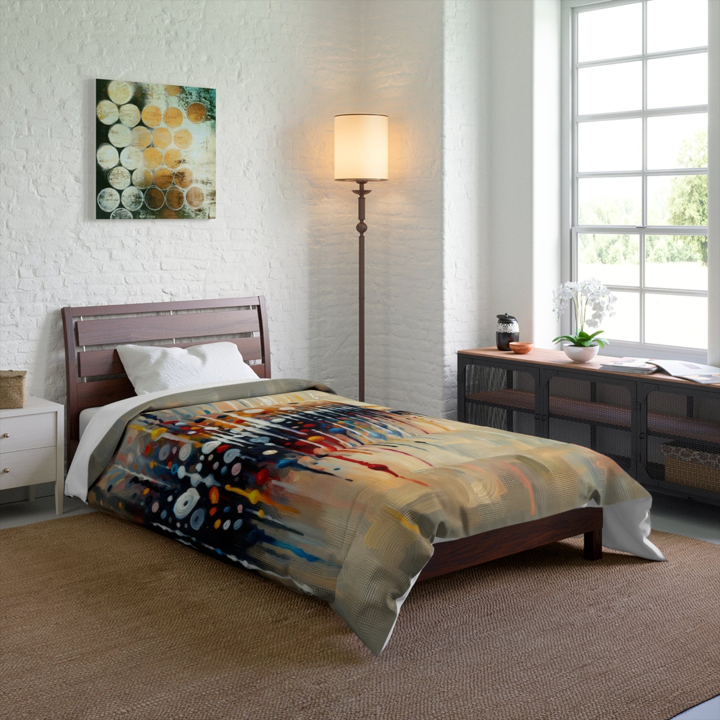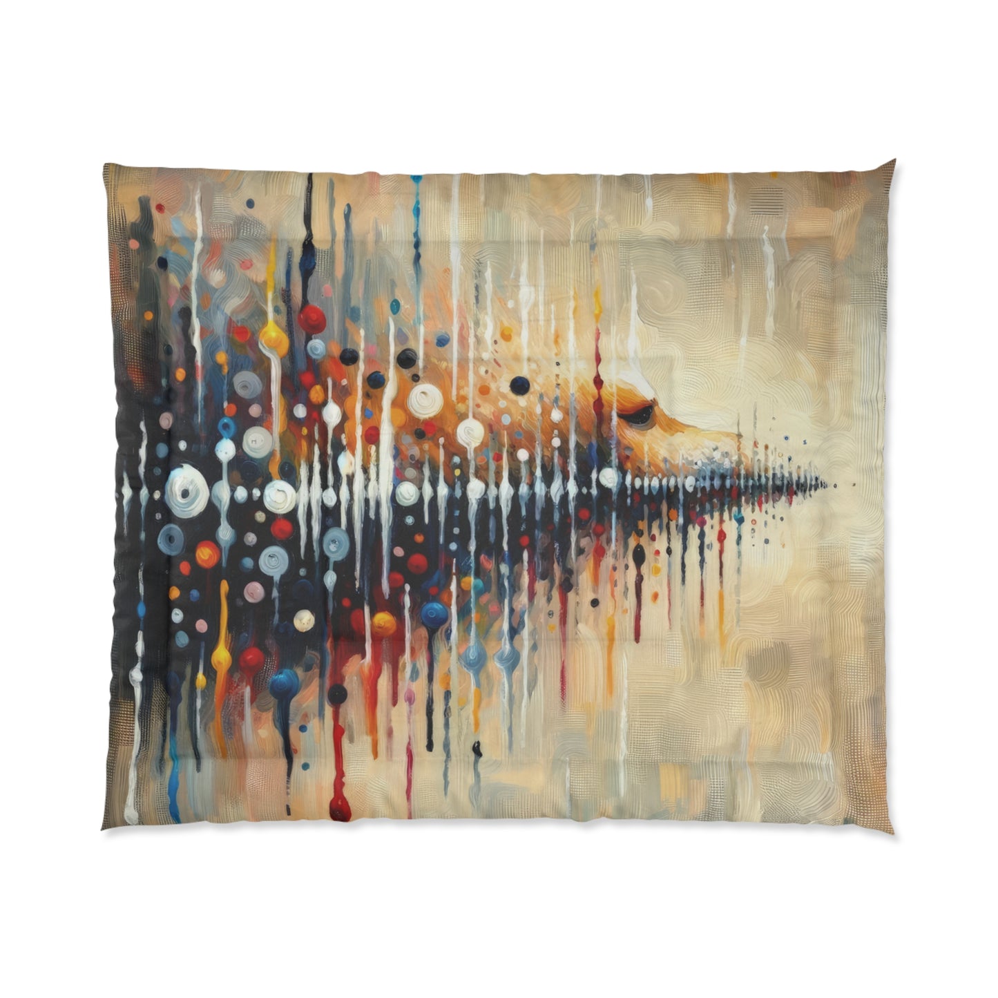 Wrap yourself up in warmth and comfort with our "Distant Barking Echoes" inspired comforter. The vibrant and dynamic design, reminiscent of the movement and energy of a dog barking in the distance, will bring a sense of life and excitement to your bedroom space. Made with 100% polyester, this blanket is cozy, fluffy, and warm, perfect for snuggling up on cold days or relaxing in bed with a cup of coffee. The lightweight material is perfect for year-round use, and the solid bright white back adds a touch of elegance to your decor. Elevate your bedroom with this unique and artistic comforter, and experience the power of art to inspire and comfort you as you rest and recharge.