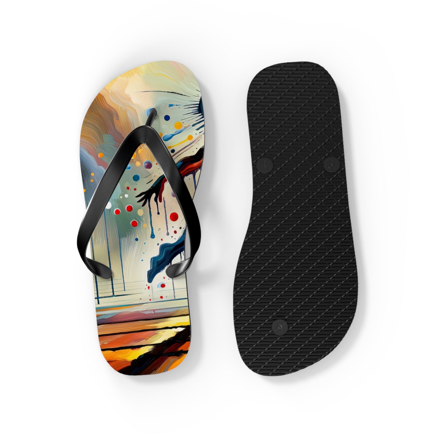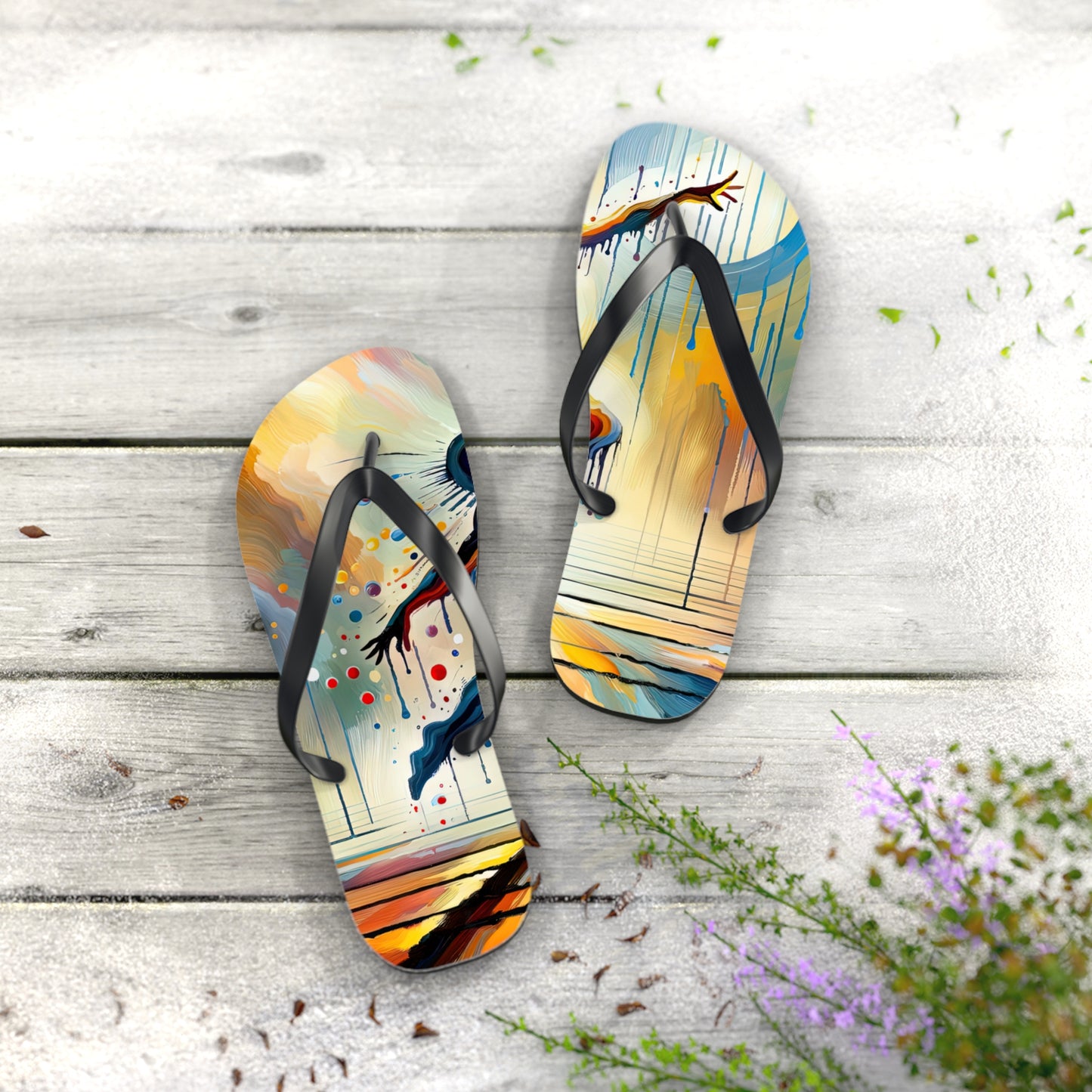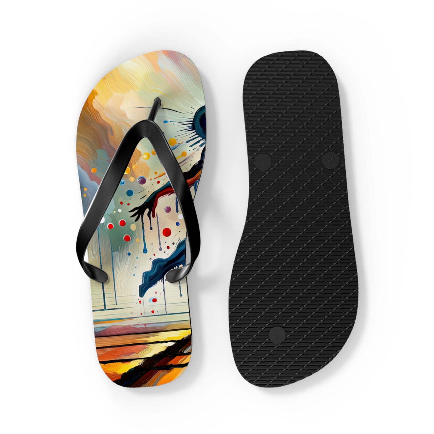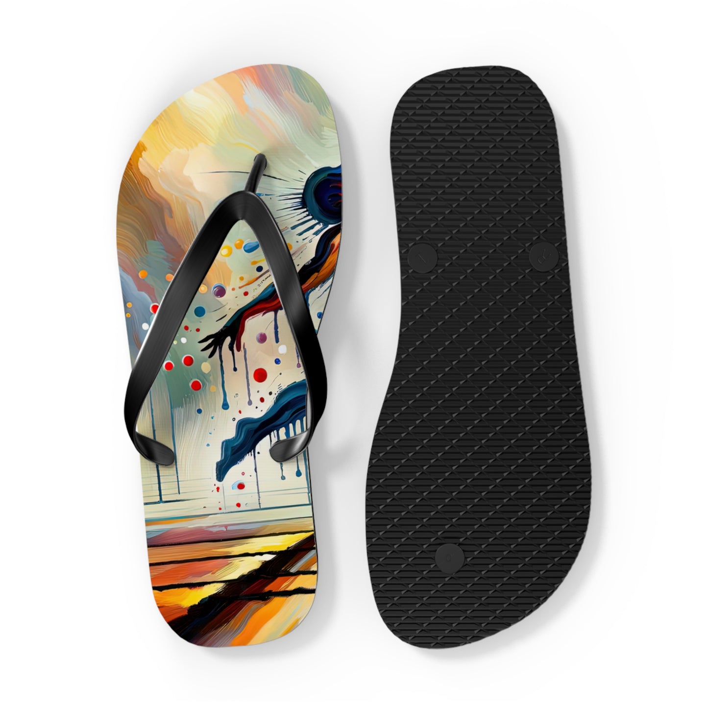 Step into summer with style and comfort with our "Expressive Dance Reflection" personalized flip flops. These flip flops are not just footwear, but a celebration of the beauty and power of expressive arts. The vibrant colors and dynamic composition of the artwork encapsulate the passion and energy of dance, reminding you to embrace the joy of movement and mindfulness as you navigate through life.