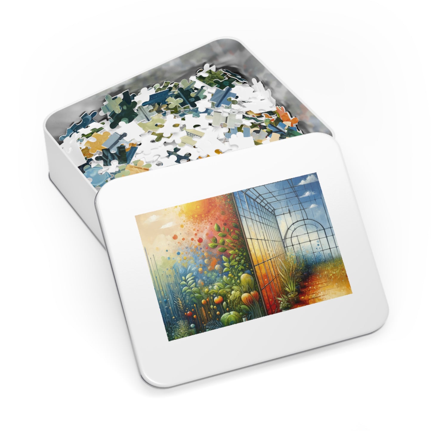 Each puzzle is shipped in a gift-ready metal box, ensuring a show-stopping presentation for your friends and family. Whether you're looking for a thoughtful gift or a fun activity to enjoy solo, our "Greenhouse Digital Genesis" jigsaw puzzle is sure to inspire awe and wonder in all who experience it. Take a break from the hustle and bustle of everyday life and delve into this captivating artwork that celebrates the beauty of interconnectedness.