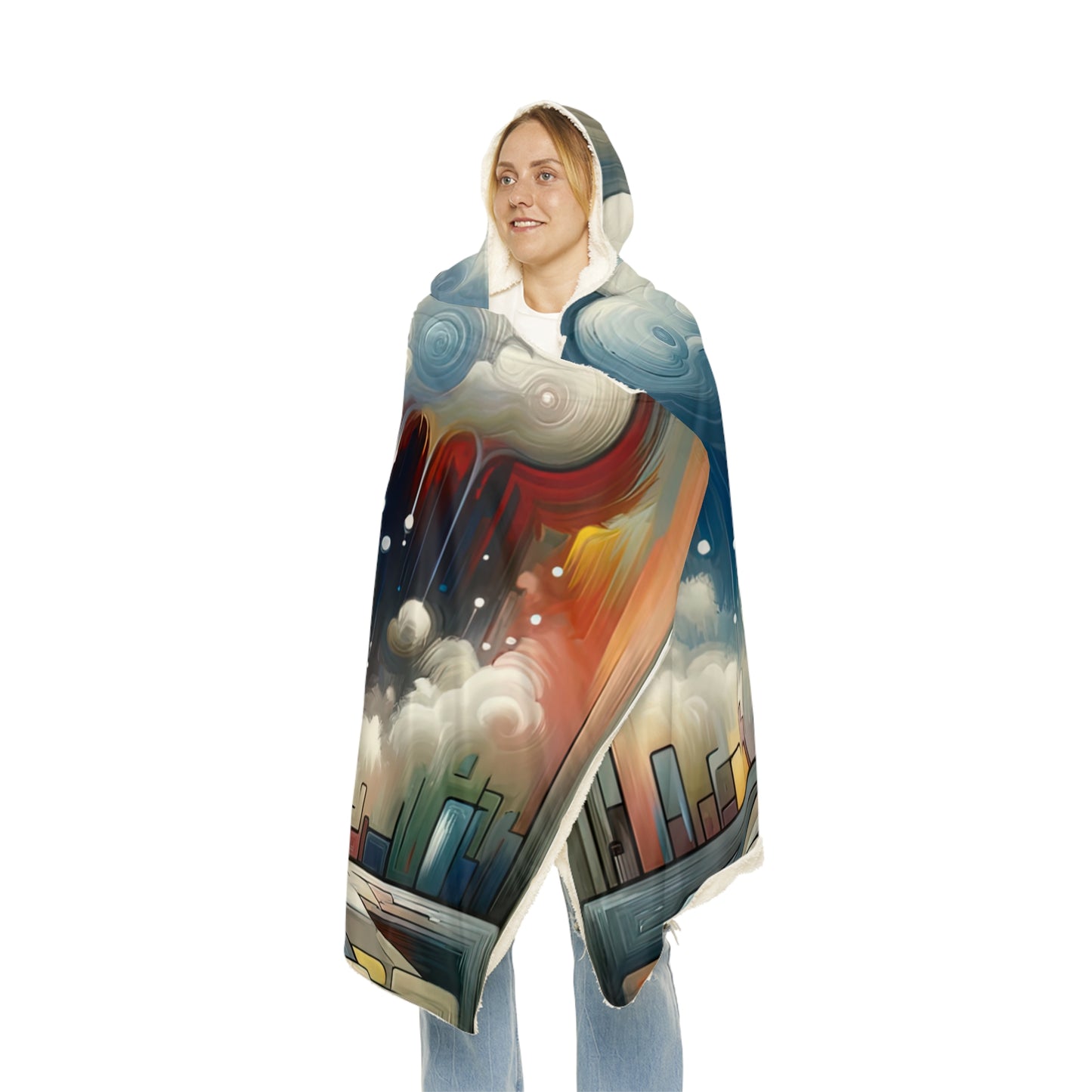 Embrace the comfort and mindfulness of "Grounding Silver Clouds" with our incredibly soft and cozy hooded blanket. Made from 100% polyester micro-mink fabric, this blanket is perfect for staying warm and snug all day long. The vibrant colors and high-resolution print of the painting will brighten up any space and bring a sense of peace and tranquility to your home.