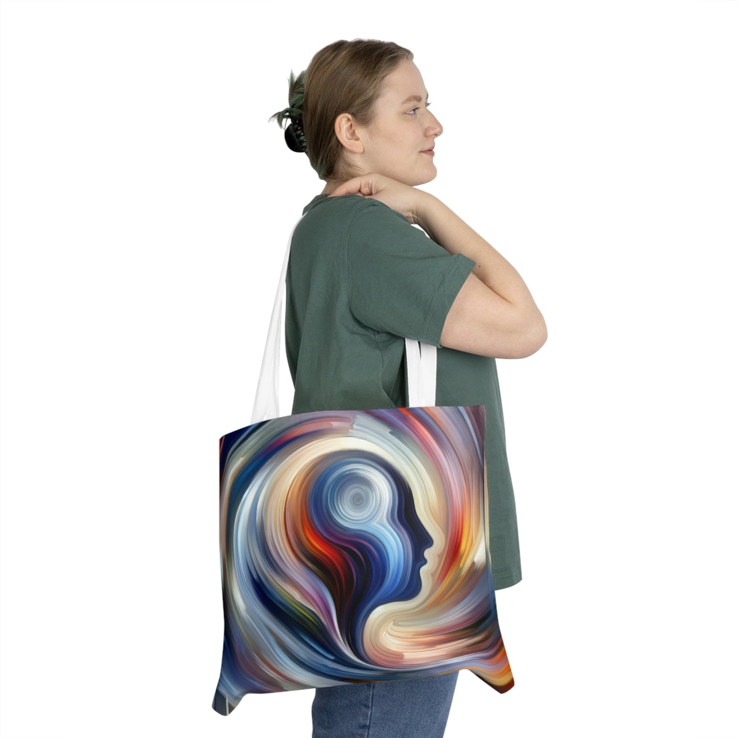 Drawing inspiration from vibrant colors and dynamic brushstrokes, this tote bag features a mesmerizing abstract design that is sure to turn heads. The central figure, a silhouette of a human profile, emerges from the abstract background, symbolizing the harmonious mindset in action. It serves as a visual reminder to embrace balance and find inner tranquility in our fast-paced lives.