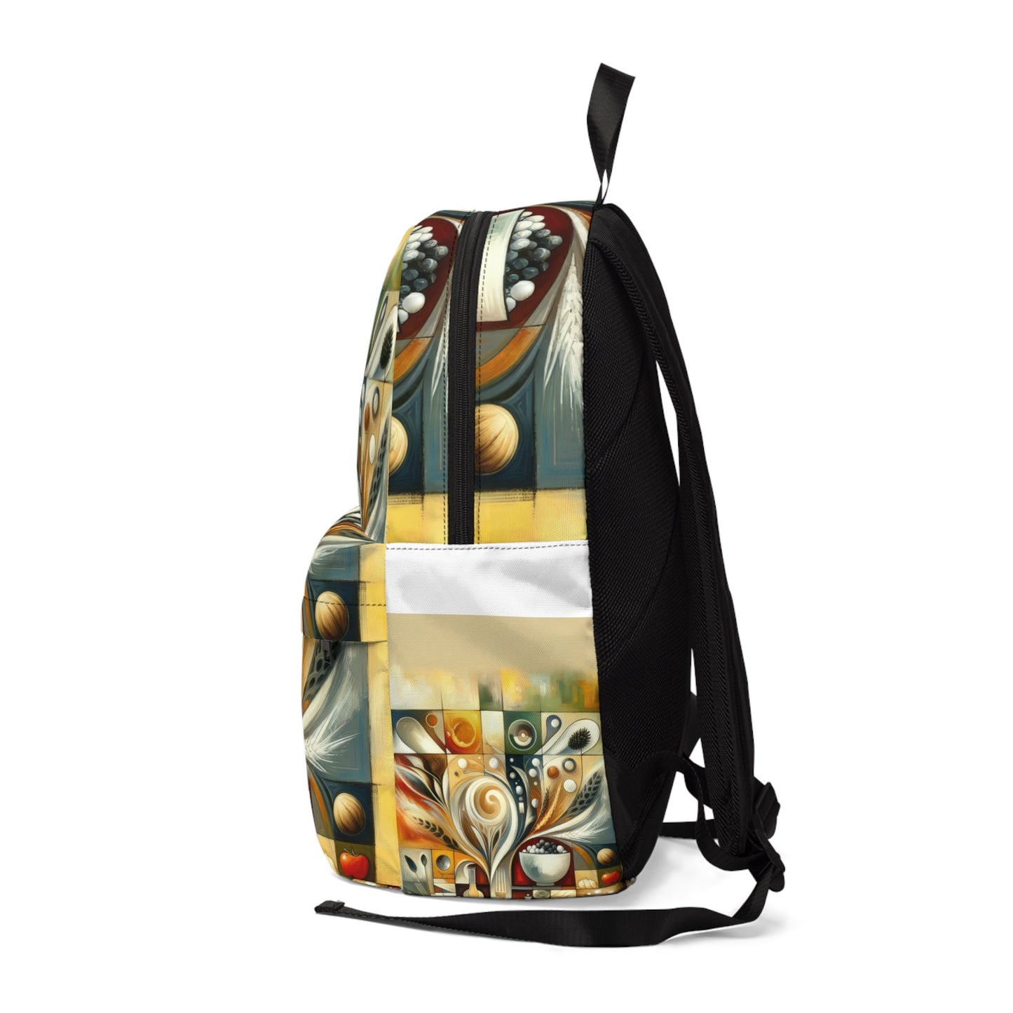 What truly sets this backpack apart is its unique application of the mesmerizing "Hearth Health Harmony" artwork. This painting, known for its thought-provoking and symbolic imagery, emphasizes the significance of mindful eating, sustainable agriculture, and the interconnection between food, well-being, and the environment.