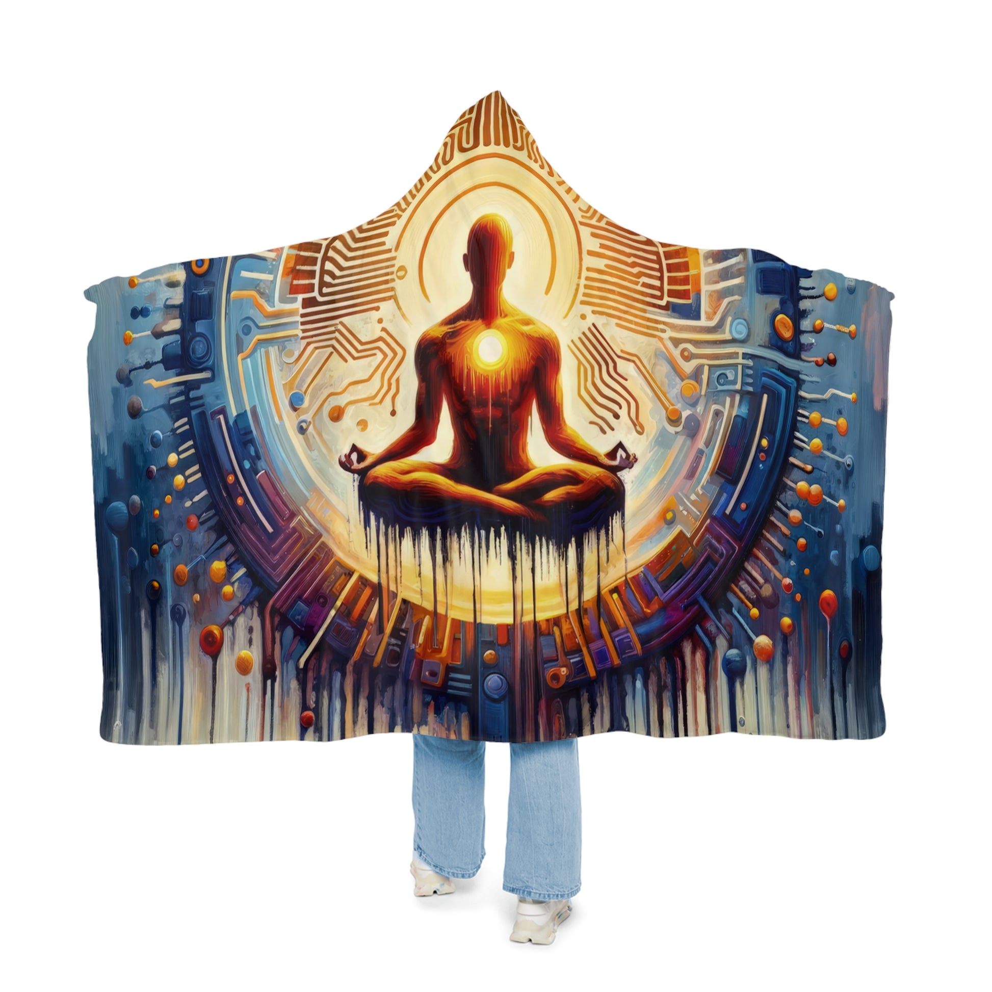 Wrap yourself in ultimate comfort and tranquility with our Meditative Technological Fusion Snuggle Blanket. This unique and artistic design invites you to embrace the harmonious balance between inner peace and technological innovation. Made with 100% polyester micro-mink outer fabric, this hooded blanket is incredibly soft and durable, perfect for cozy days lounging at home. Choose between the ultra soft microfleece or plush polyester sherpa lining options for added warmth and comfort. The vibrant colors and high resolution printing of your original design create a stunning visual display that encourages reflection on the interconnectedness of humanity and technology. With elastic straps on the inside for added convenience, this one-size blanket (80" x 55") is the perfect choice for staying warm and stylish all day long. Embrace the fusion of mindfulness and modernity with our Meditative Technological Fusion Snuggle Blanket.