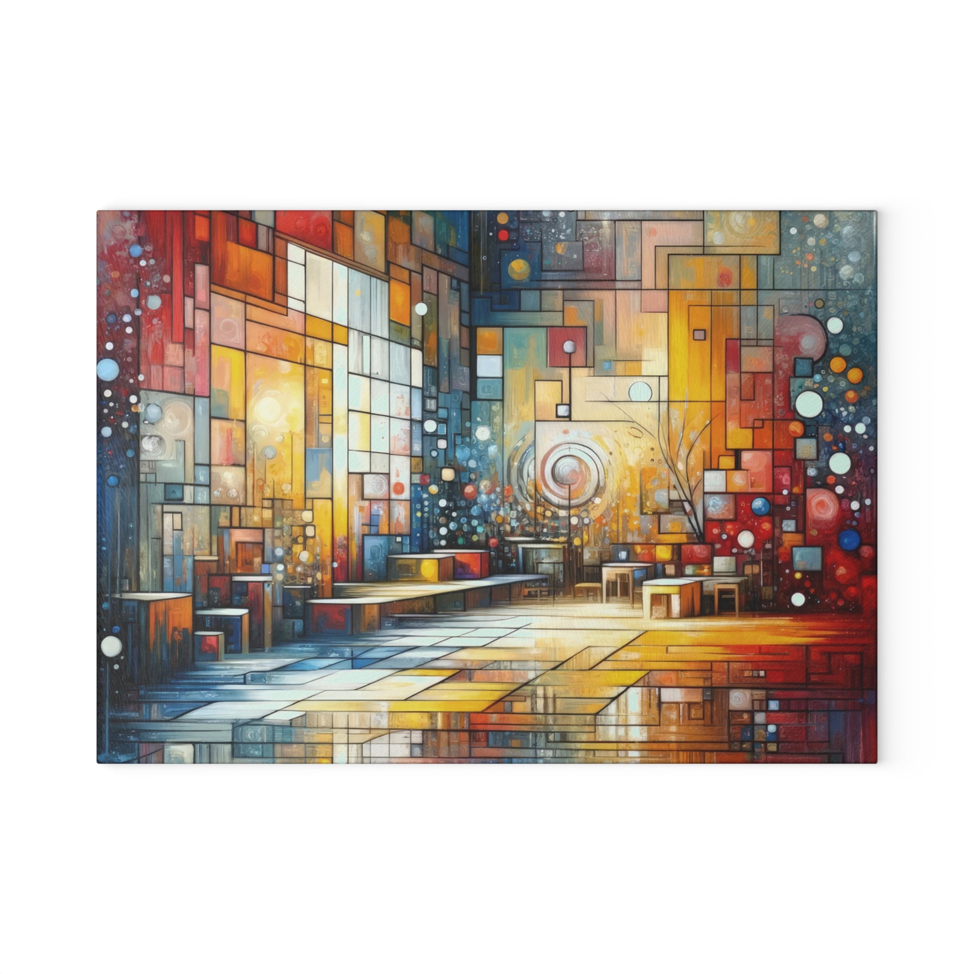 Enhance your kitchen with a touch of artistic flair with our "Reflective Habitation Art" glass cutting board. This custom piece features a mesmerizing design that invites contemplation on the spaces we inhabit, both externally and internally. The artwork's dynamic composition and thoughtful use of Tachism techniques create a captivating visual experience that will elevate your cooking space.