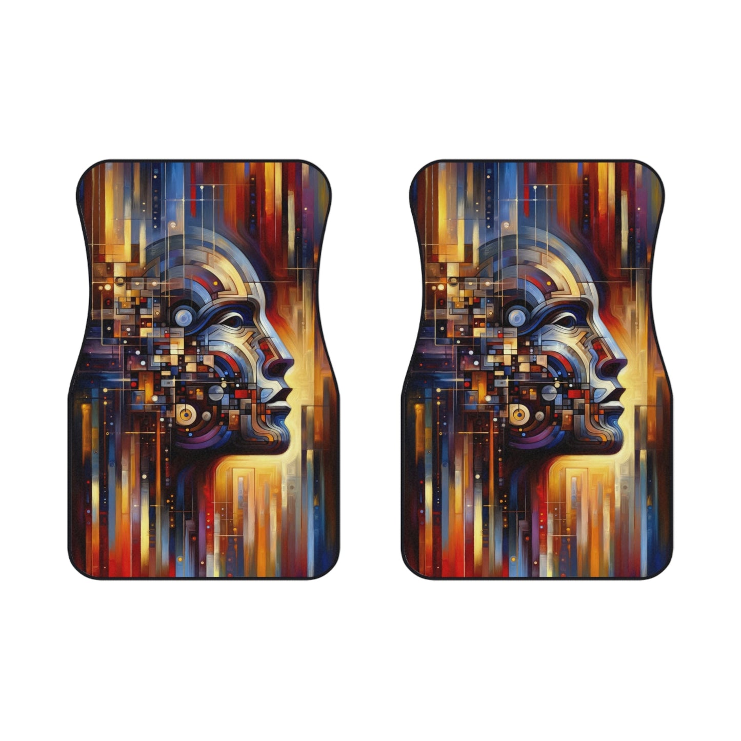 With a white base and black trim, these car mats offer a sleek and cohesive look that complements any interior. Customize your ride with this unique artwork that challenges and engages, creating a personal and reflective space within your vehicle. Upgrade your car's style and add a touch of philosophical contemplation with the Reflective Tachism Shield Car Mats.