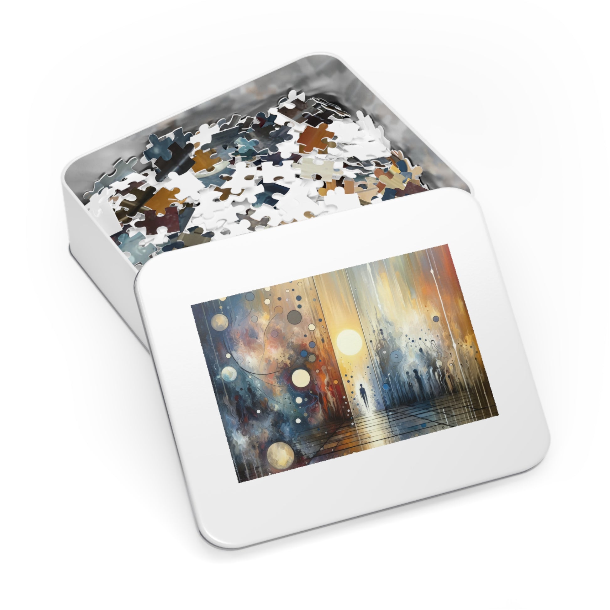 Presented in a sleek white metal tin box featuring the finished image on the cover, this puzzle makes a stunning gift for friends and family. Whether you're looking for wholesome downtime or a creative outlet, "Stillness Transition Abstract" jigsaw puzzle promises hours of enjoyment and contemplation. Embrace the balance of chaos and serenity, change and stability, as you embark on a journey of self-discovery through the art of puzzle-solving. Order yours today and experience the beauty of stillness in motion.