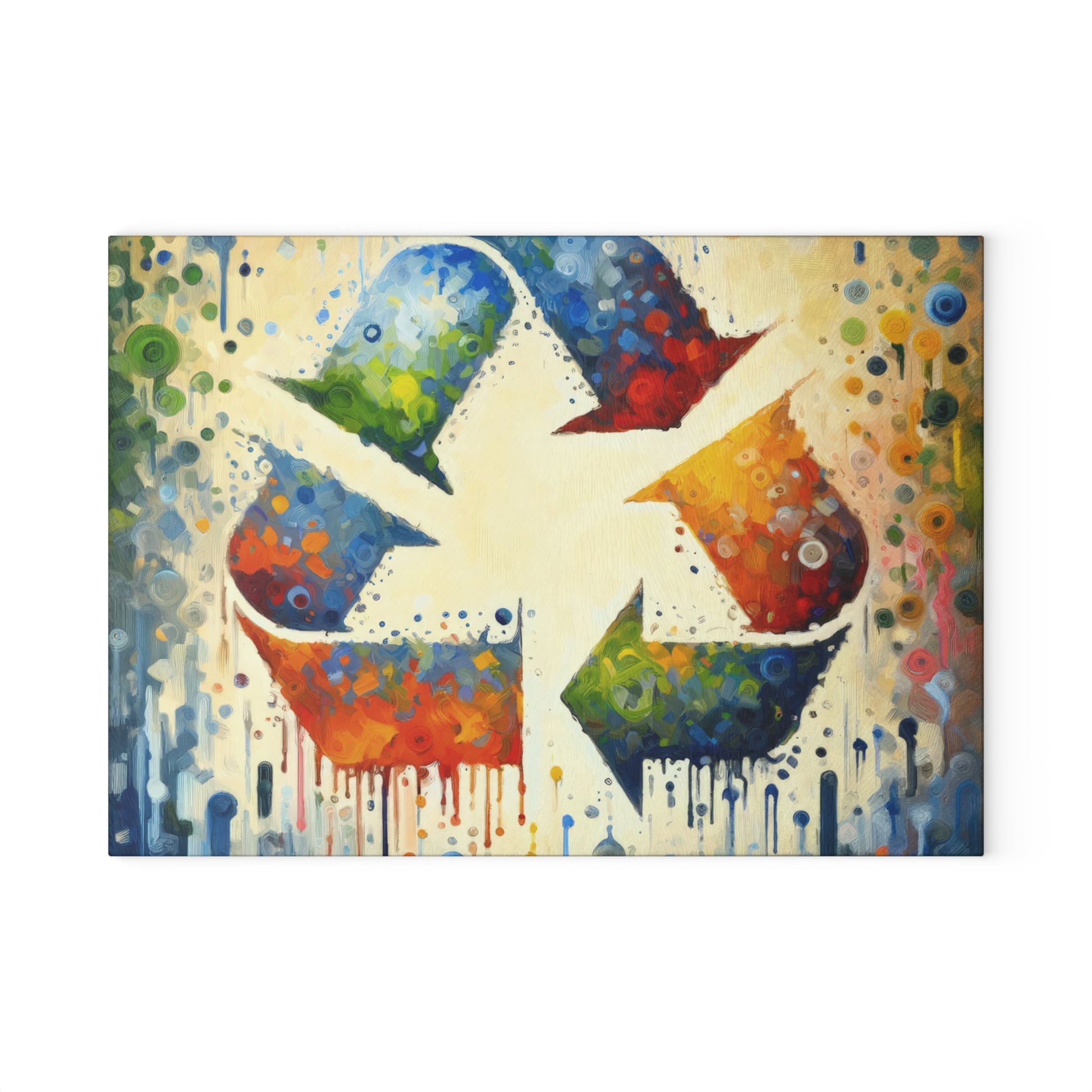 Bring a touch of artistry and eco-consciousness into your kitchen with our "Sustainable Transformation Tachism" Glass Cutting Board. This custom cutting board features a vibrant and dynamic painting that serves as a thought-provoking commentary on the pressing need for sustainable practices in our modern world. The recycling symbol at the center reminds us of the importance of reducing, reusing, and recycling to protect our environment for future generations.