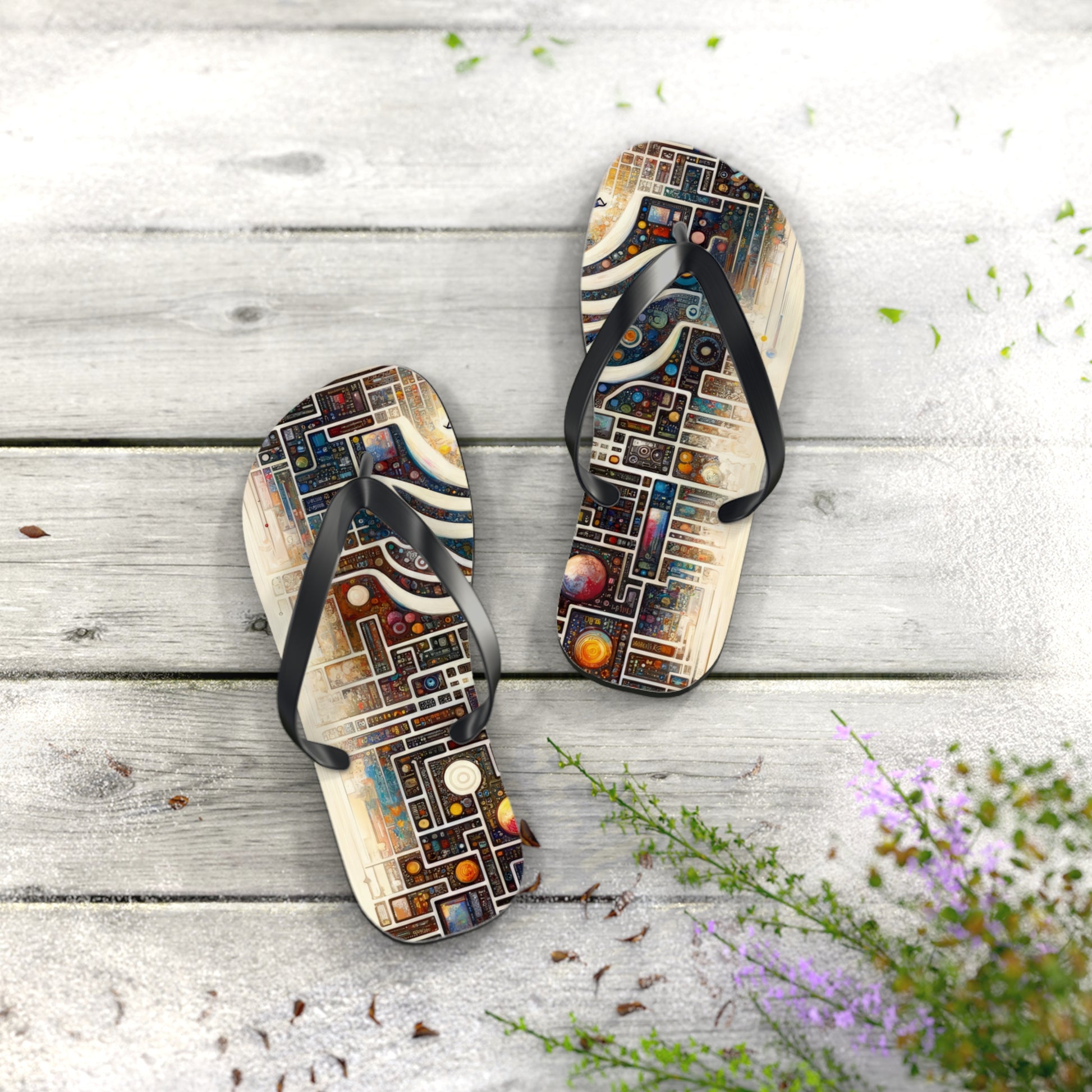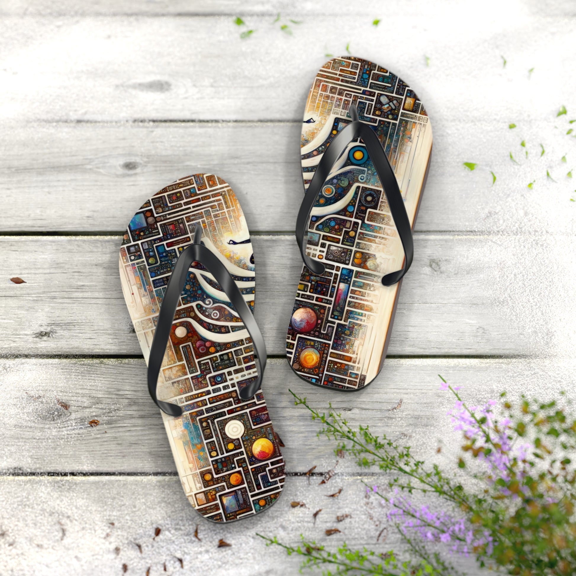 Embrace the intersection of humanity and technology with these unique flip flops that challenge you to consider the possibilities of a symbiotic relationship between the two. Stand out in a crowd with a design that raises questions about spirituality in the digital age, reminding us to find balance in our advancement.