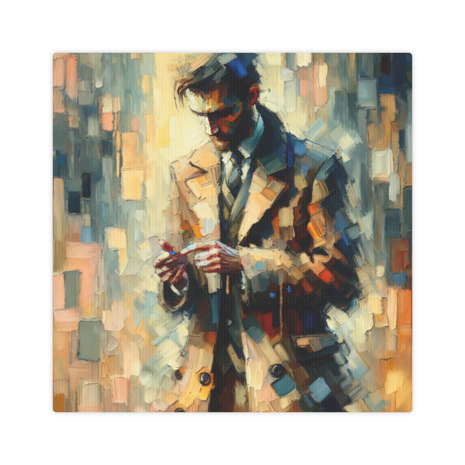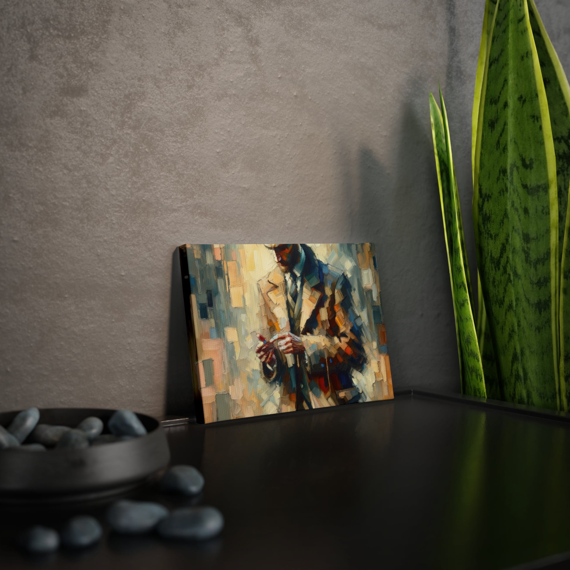 Introducing the captivating "Urban Tachism Encounter" Canvas Photo Tile, a stunning blend of abstract expressionism and figuration that invites viewers to immerse themselves in a moment of quiet contemplation amidst the bustling energy of city life. This beautifully crafted piece captures the essence of both isolation and connection, urging us to reflect on the complexities of human existence within a modern urban landscape.