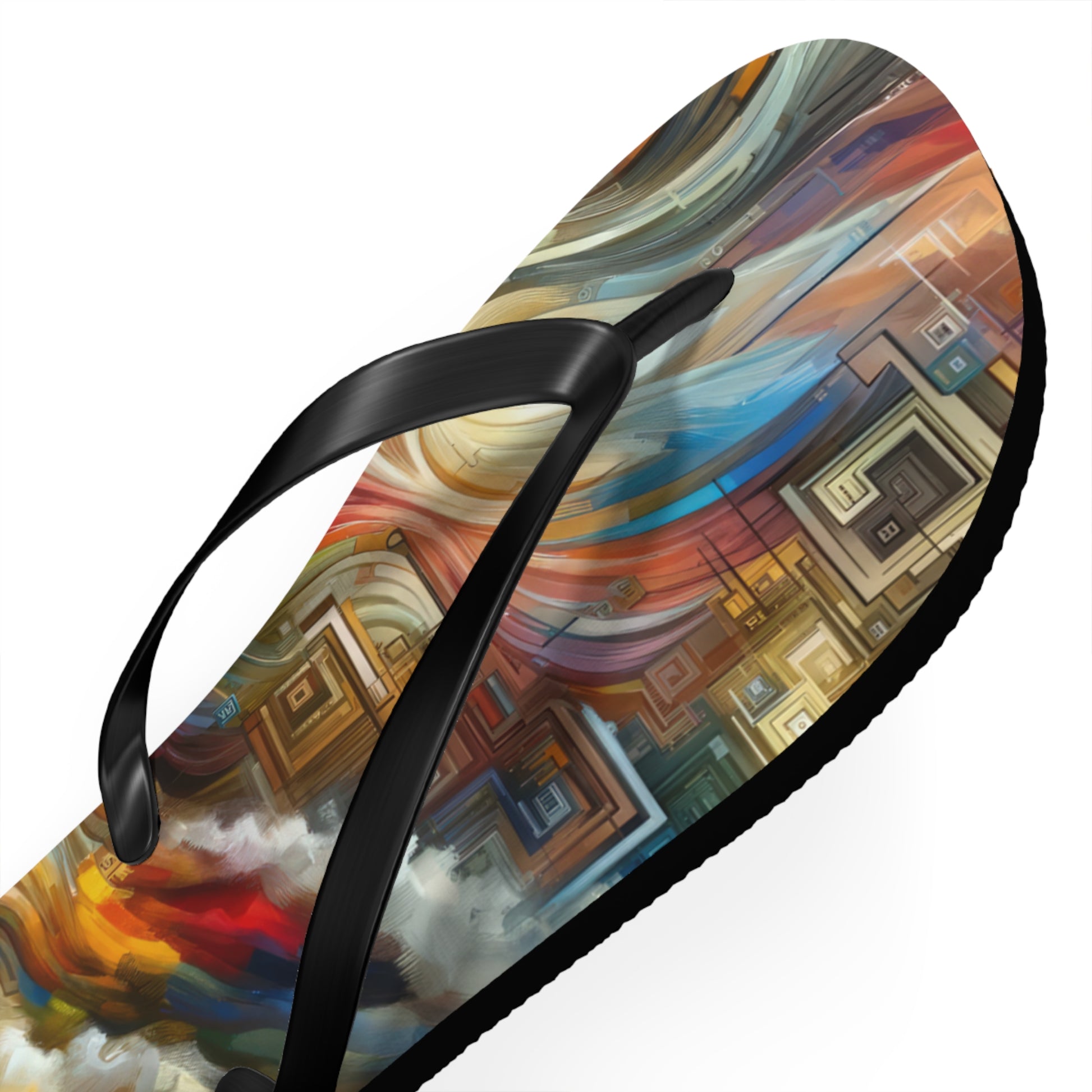 Step into summer in style with these personalized flip flops featuring the mesmerizing "Woven Progress Tapestry" design. Embrace all-day comfort with their easy slip-on design, cushioned footbed, and top-tier printing fidelity. Made with EVA, polyester, and PVC materials, these flip flops boast a 5/8" thick EVA sole with a textured bottom for added grip, a 100% polyester suede sole cover for a luxurious feel, and a black PVC strap for durability. Available in multiple sizes, these flip flops run true to size and are guaranteed to be a summer hit. Elevate your summer escapades with these unique and stylish flip flops that showcase the beauty and complexity of human progress.
